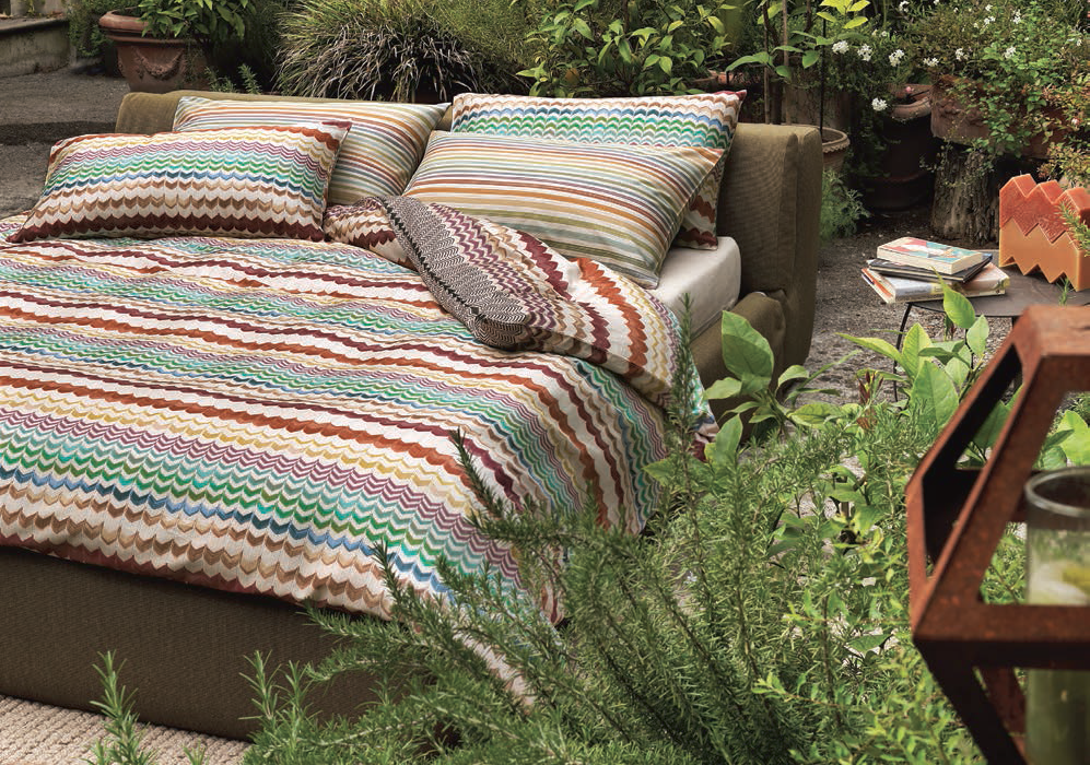 Missoni Home’s Fiore Pop range offers an eclectic blend of styles in one collection. This comforter cover set in satin cotton has a multi-coloured – unmistakably Missoni – chevron print (www.missonihome.com).
