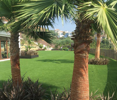 Throughout my lifetime plants have always been a great part of my life. When I was a child, I could spend hours with my grandmother kneeling in her rock garden taking out weeds or splitting plants to replant them a few metres away. Walking with my dogs in nature, observing the plants I see along the way, makes me calm and happy. You can imagine I was not particularly ecstatic the day my husband came up with the idea of selling artificial grass! In fact, it was the only time in our trajectory working together that we were really disappointed. A few weeks later, the first 1,200 metre square garden we completed convinced me 100 per cent that artifical grass was extremely important. This family had a very active and large dog who was running around in the garden all day. It was impossible to have a nice natural lawn growing in that garden. My husband convinced them to build beautiful borders with Tosco stones to separate grass areas from planting areas and to blend the look of artificial lawn with the very traditional Andalucian style of the villa. I planted beautiful tropical palm trees and colourful plants around the whole garden. Today, 10 years and three dogs later, the artificial lawn still looks green and attractive. The tropical palm trees have become huge and the water bills they have saved over 10 years are just amazing.