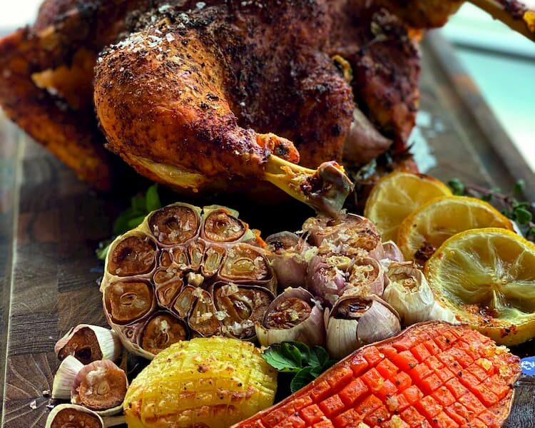 Put the poked lemon, some crunched garlic, a bit of salt and the fresh spices into the chicken. Mix all the spices together and rub them onto the skin of the chicken. Our favourite garnish, fast, easy and tasty… Cut the top off a full garlic, make slices of lemon and cut the batata in half and carefully cut the inside of the sweet potatoes, before putting some olive oil, Maldon flake salt and pepper on top. Add some fresh spices and chili if you want an extra spicy touch. Place it all into the pan together with the chicken and bake in the oven at 200 degrees for about 50 minutes.