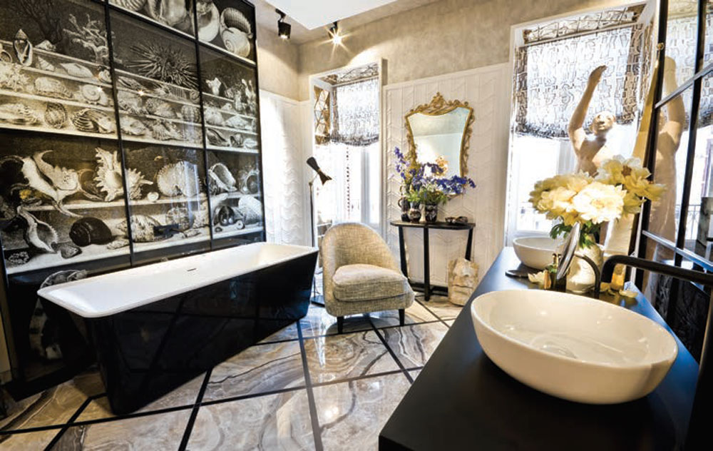 Designer Erico Navazo created a wellness project for Villeroy & Boch (pictured above), transforming a bathroom into an intimate, comfortable and sophisticated oasis with an ocean theme. He used Artis washbasins made from TitanCream, bathroom fittings lacquered in black, rhombus-shaped ceramic wall cladding, and a free-standing Squaro Edge bath manufactured with exclusive Quaryl material. www.villeroy-boch.es