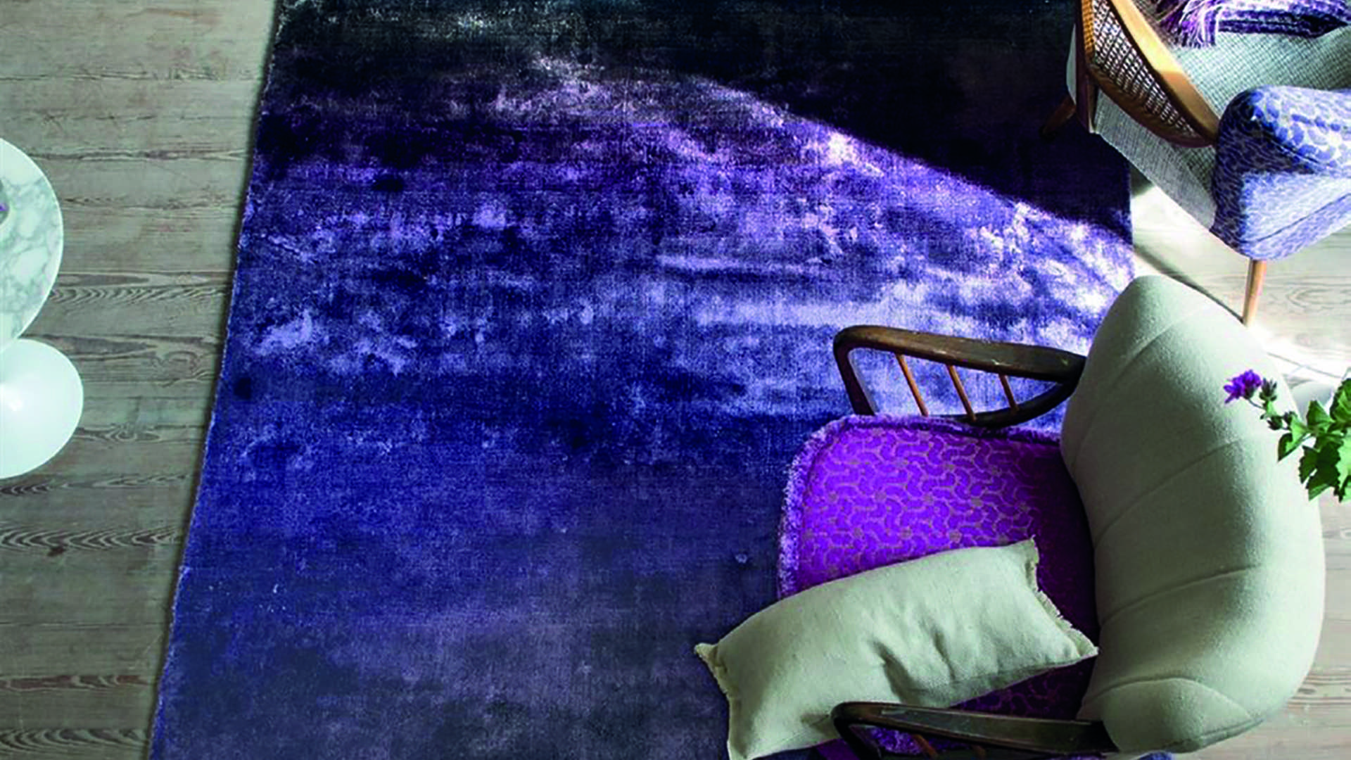 Above Left Oak flooring, shown here from the Trinity range, offers a warm look and feel, as well as durability. As wood ages it is enhanced aestheti cally. Available from Korsch Tischlerei in Pol. Ind. Elviria (www.korsch-tischlerei.com). Above Right The hand-tufted Phipps rug in a rich aubergine purple from Designers Guild is made from 100 per cent viscose and has a robust finish. Designers Guild is available through Tela Bella near Pol. Ind. Es-tepona (www.telabella.es), the Alison Bethell-Collins studio in San Pedro de Alcántara (www.alisonbethell-collins.com), Ambar Decoraciones in Avda. del Mar Mediterráneo in San Pedro de Alcántara (www.am-bardecoraciones.com), Casasola Décor near Torre Real (www.casasoladecor.com), Cort Idea on the Mi-jas Road (www.cortidea.es) and Estuco Interiors in C. Plaza in Nueva Andalucía (www.estucointeriors.com).