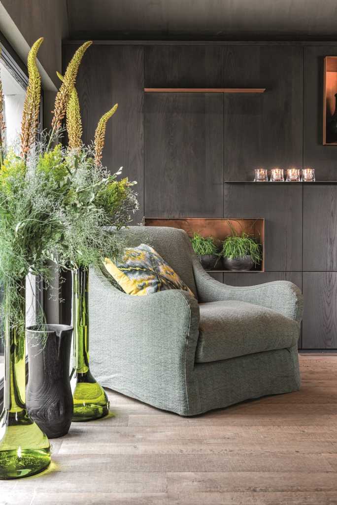 Cristina olive green glass vases from Gommaire are like oversized Florence flasks. They create a dramatic look celebrating tall flowers and plants in all their glory. Shown here with their handmade pots. Available from Siesta Interior Design in C. Plaza in Nueva Andalucía (www.siestainteriordesign.com) and Acoola in Pol. Ind. San Pedro de Alcántara (www.acoola.eu).