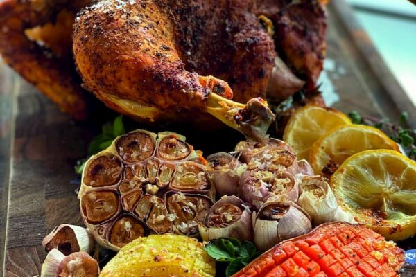 Once cooled, rub the skin away with a piece of kitchen paper; it should come away easily. I also like to wear a pair of rubber gloves when I do this to stop my hands from turning red. Cut away the root and stalks and then use as desired.
