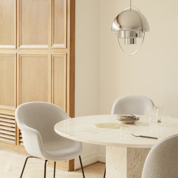 Gubi’s travertine stone Epic dining table was designed by GamFratesi as a sculptural piece of furniture inspired by Greek columns and Roman architecture. The Bat dining chair offers the distinctive shape of a bat’s wingspan and comfortable seating. The shell comes in a range of colours and upholstery options (www.gubi.com)
