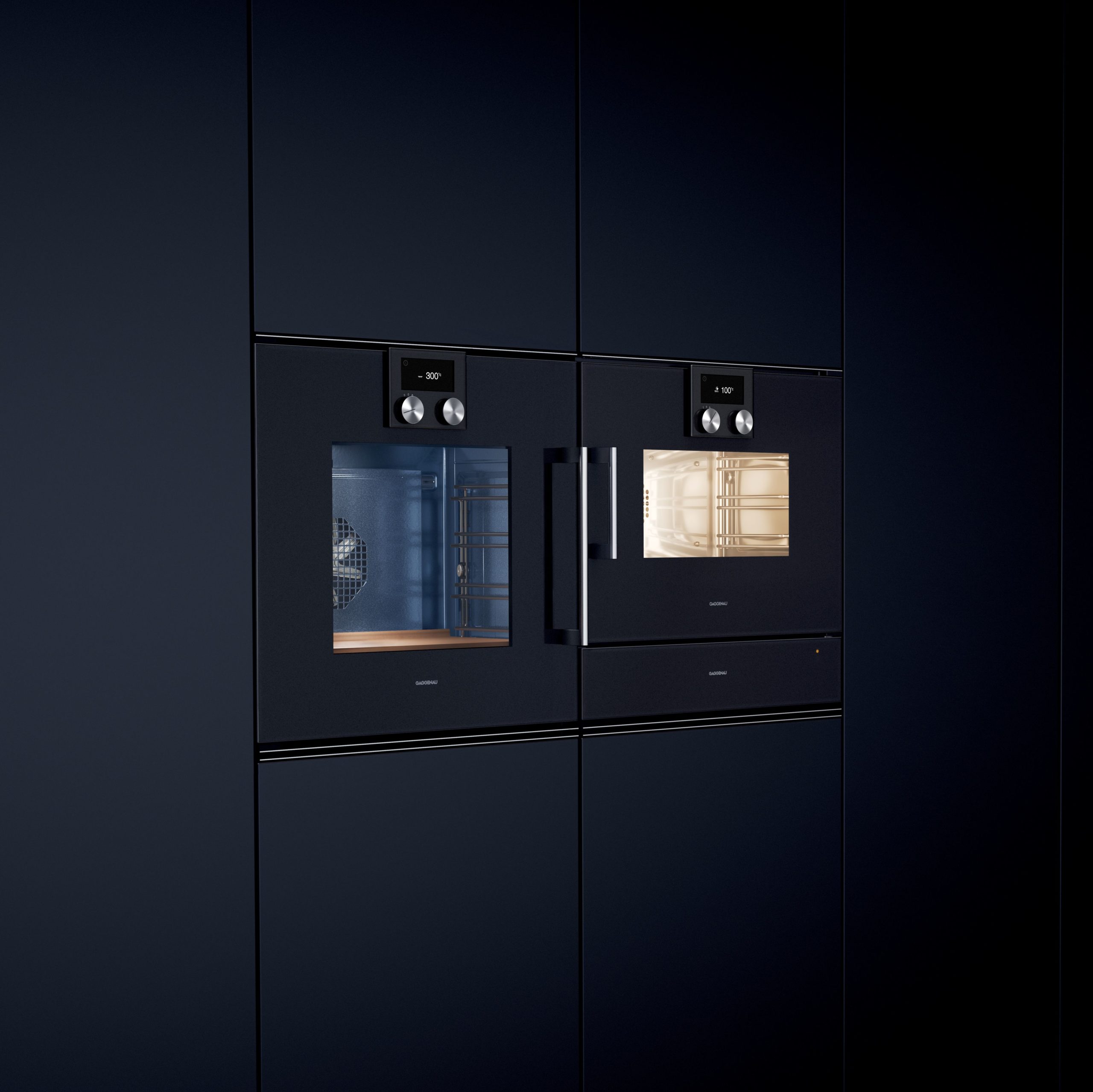 Gaggenau’s new combi-steam oven 200 series offers a fixed water connection as well as a fully automatic cleaning system, a multicore temperature probe and a full surface grill hidden behind the inside of the oven.