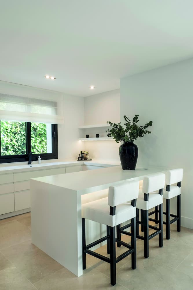Antima’s Jura barstools are custom-made, with black lacquered legs that contrast with their Cloud fabric upholstery and offer a chic look for any kitchen bar area.