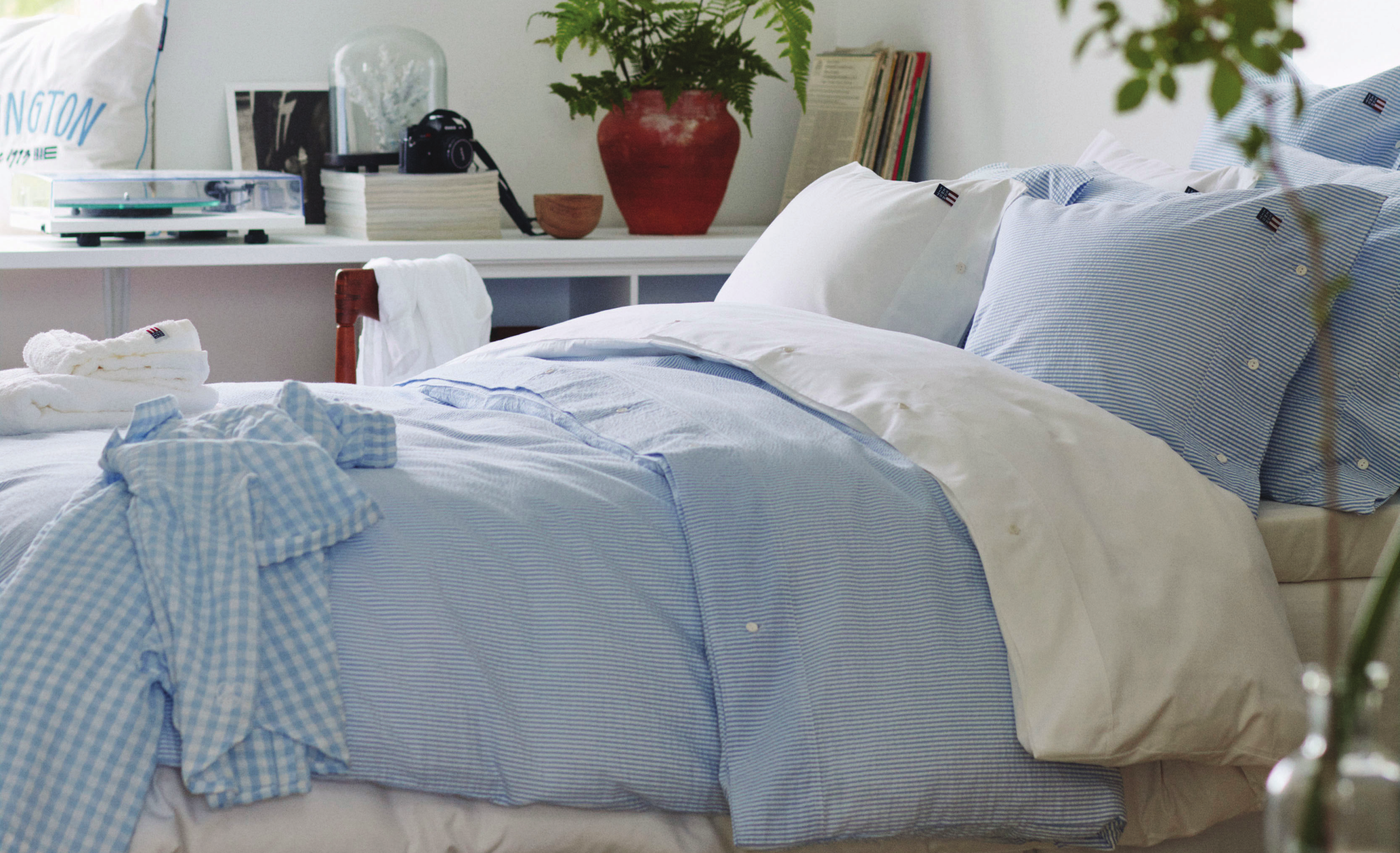 The blue and white striped cotton poplin bed linen from Lexington is cool and crisp, with Oeko-tex certification. It comes with Lexington rubber buttons at the bottom of the duvet cover and the pillowcase has an enve lope closure (www.lexingtoncompany.com).