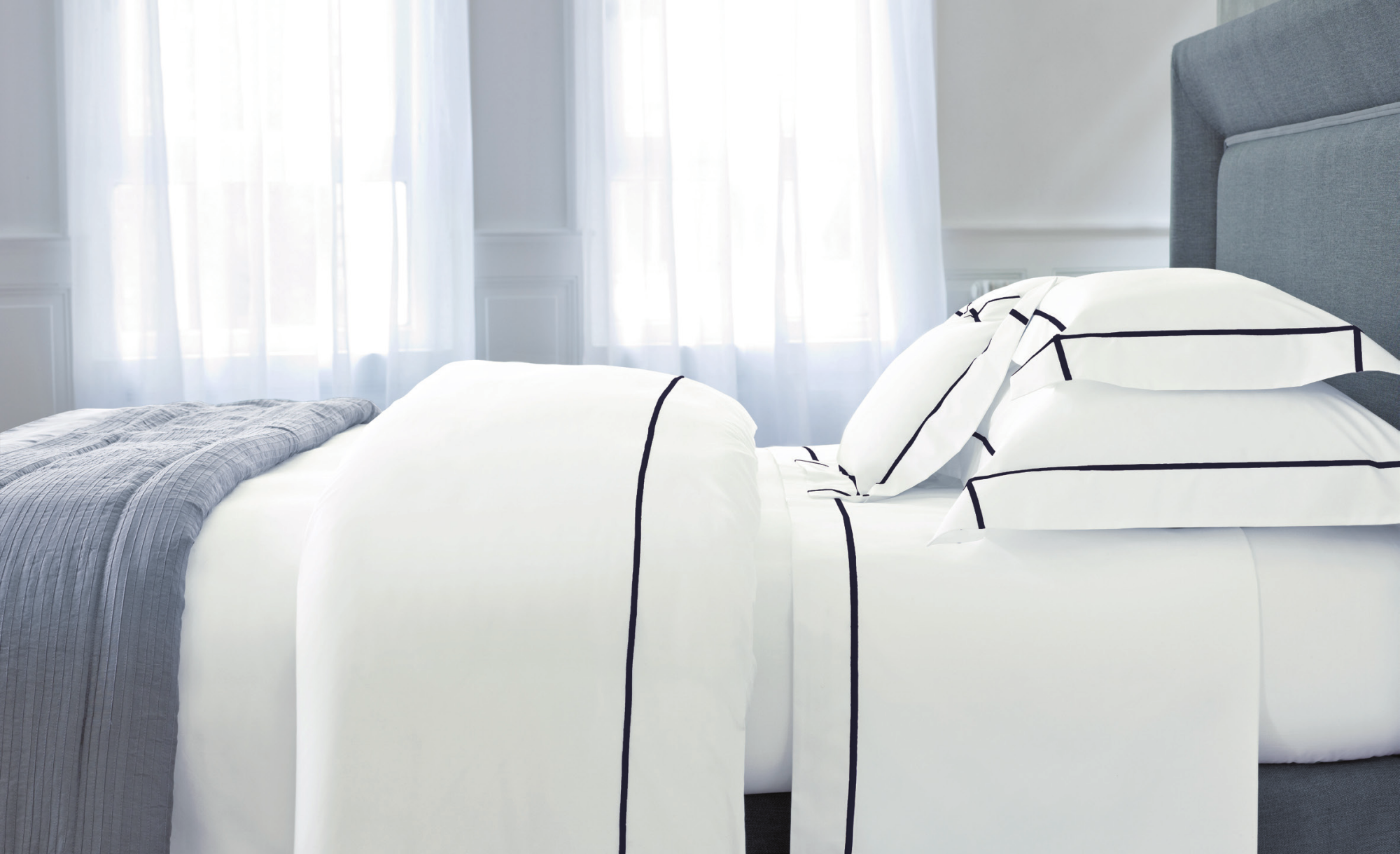 The 100 per cent cotton Flandre bed linen by Yves Delorme offers a timeless contemporary design in crisp white embellished with a black em broidered trim and a piped finish (www.yvesdelorme.com).