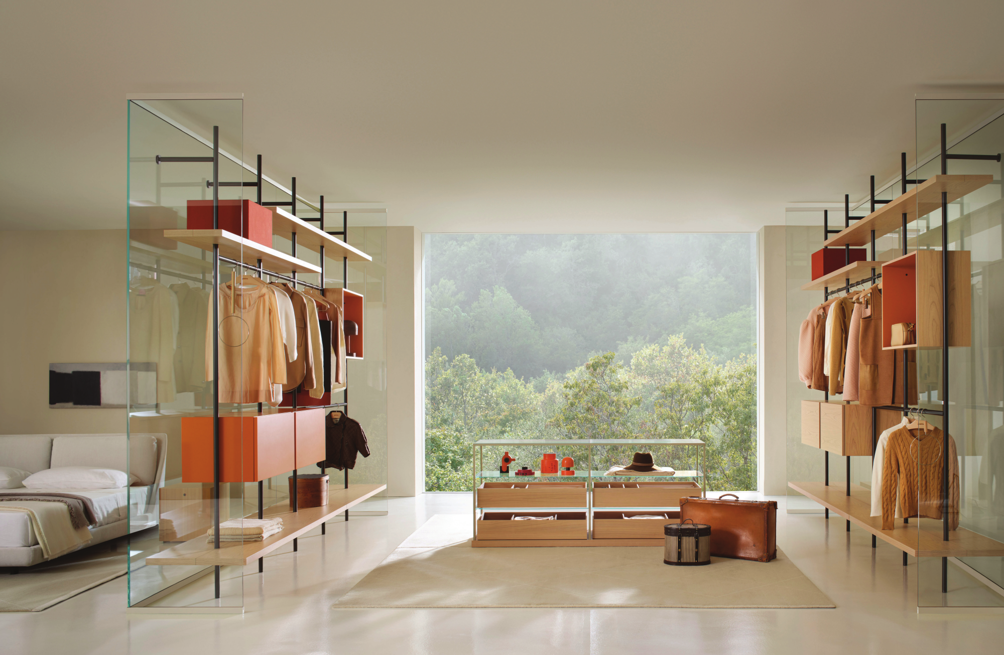 Designed by Piero Lissoni + CRS Porro, the Boutique Mast dressing rooms are sophisti cated and elegant, featuring glass with thin round metal uprights in iron finish and canti levered white cherry shelves. Placed on the sides, they leave the stage to the Acquario storage unit, designed by Piero Lissoni and featuring a cuvée frame with glass shelves, base and drawers in white cherry that over looks the landscape. Both are made with a new cutting-edge machine that processes panels when required, thus eliminating stocks for the sake of maximum customisation, high quality and a low footprint on the surround ing environment (www.porro.com).