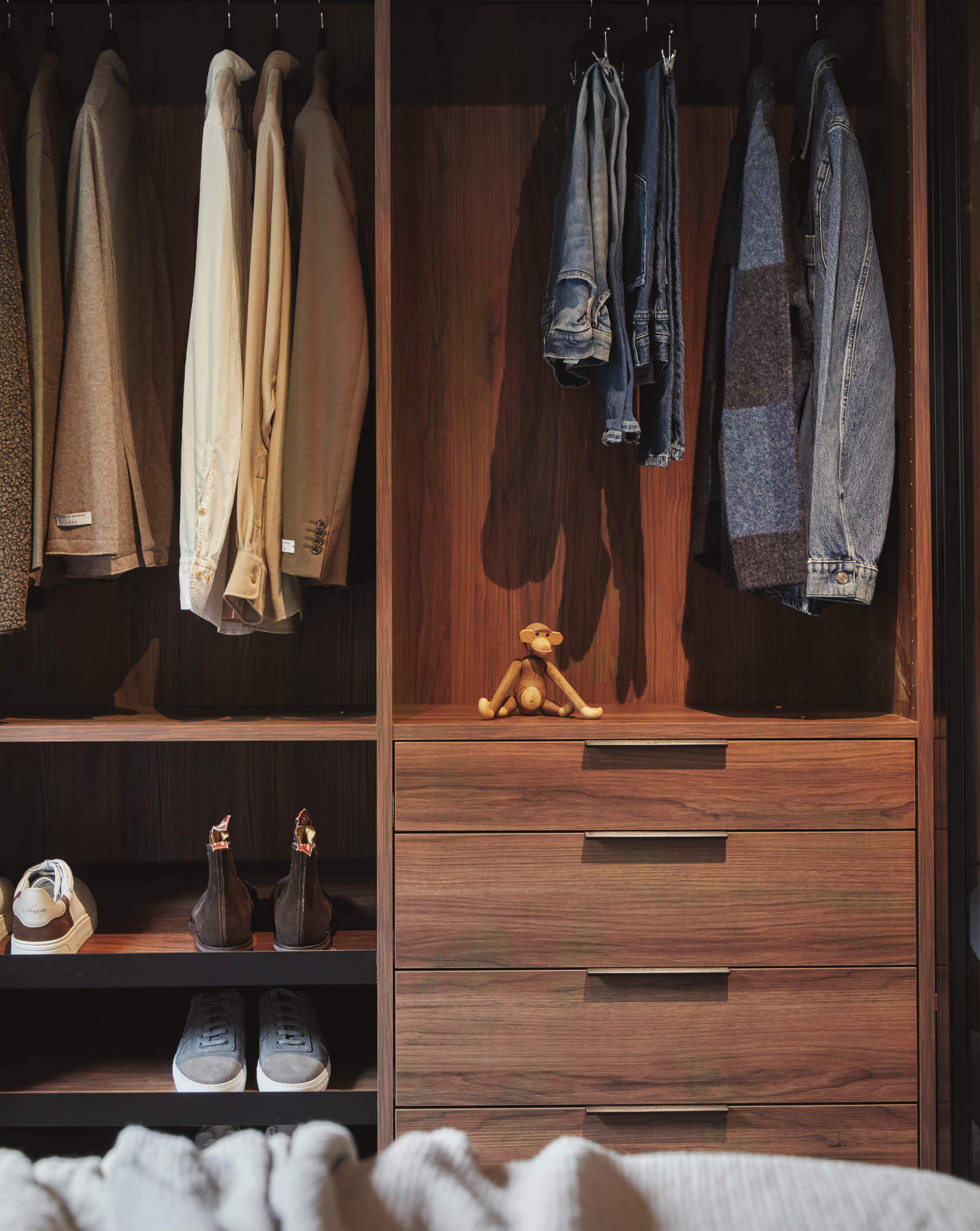 This walnut wardrobe gives a luxurious feeling and also one of cosiness. The interior lighting and black shown in features such as the handles and rail add a contemporary aesthetic. The wardrobe offers a variety of ways to organise your clothes including an open and hidden shoe shelf. Available from Ballingslöv, situated in Centro Comercial Plaza in Nueva Andalucía (www.ballingslov-marbella.se).