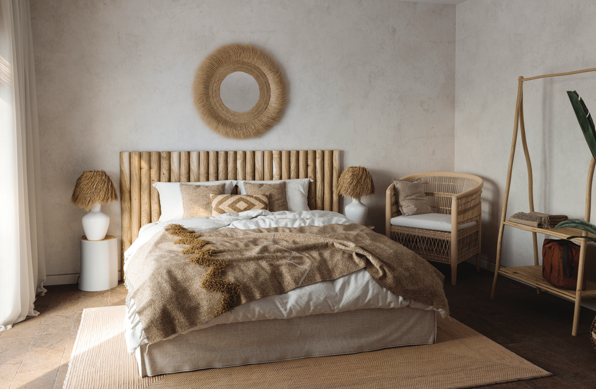 This Scandinavian boho-style bedroom is filled with natural materials such as teak, wool, wicker and rope, giving the space an organic feel in calming, soft earthy tones. Everything is available from New Life Home in Avda. de Velázquez in Málaga, or shop online at www.newlifehome.es.