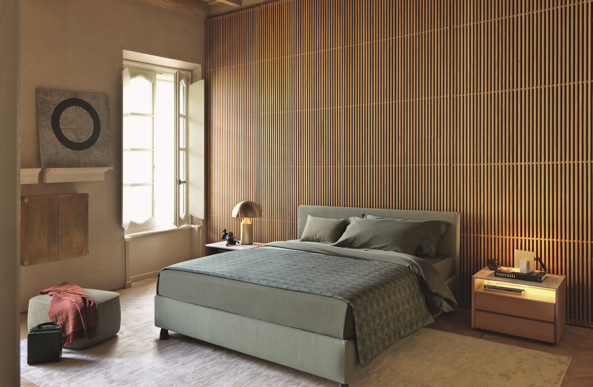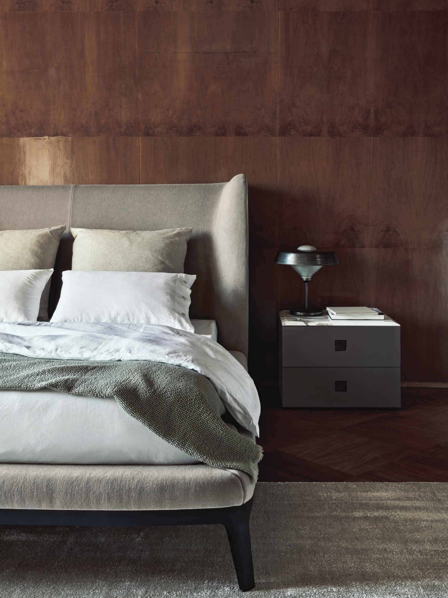 The design of the eponymous Dragonfly bed by Flexform combines graceful harmo ny with high-quality craftsmanship. The high, generously-padded headboard has an en veloping shape that provides a feeling of inti macy. Its sophisticated, solid ash base can be stained in various shades (www.flexform.it) .
