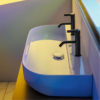 The Bricks range from Designa features solid wooden legs in natural, rustic, black and white oak. It is shown here with their marble matt white sink with handy built-in cabinetry.