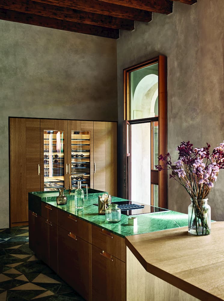 Cesar’s Intarsio range combines material and colour contrasts with the Williamsburg counter, which is monolithic and compact and offers structural strength with aesthetic simplicity. Its sleek clean lines are contrasted by the soft warmth of the wood, while metallic handles provide a touch of splendour to finish-off the overall look.