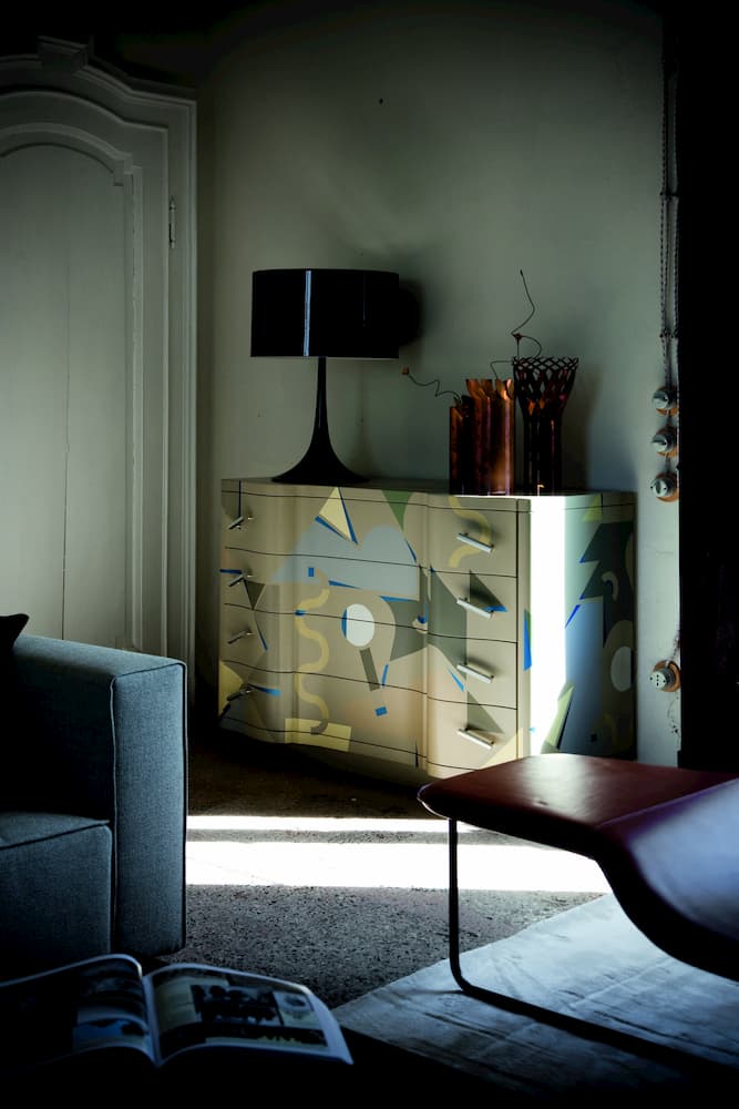 Zanotta’s 7860 Cetonia chest of drawers was designed by Alessandro Mendini. It features a lacquered wooden frame with hand-painted polychrome decoration and natural anodised aluminium handles.