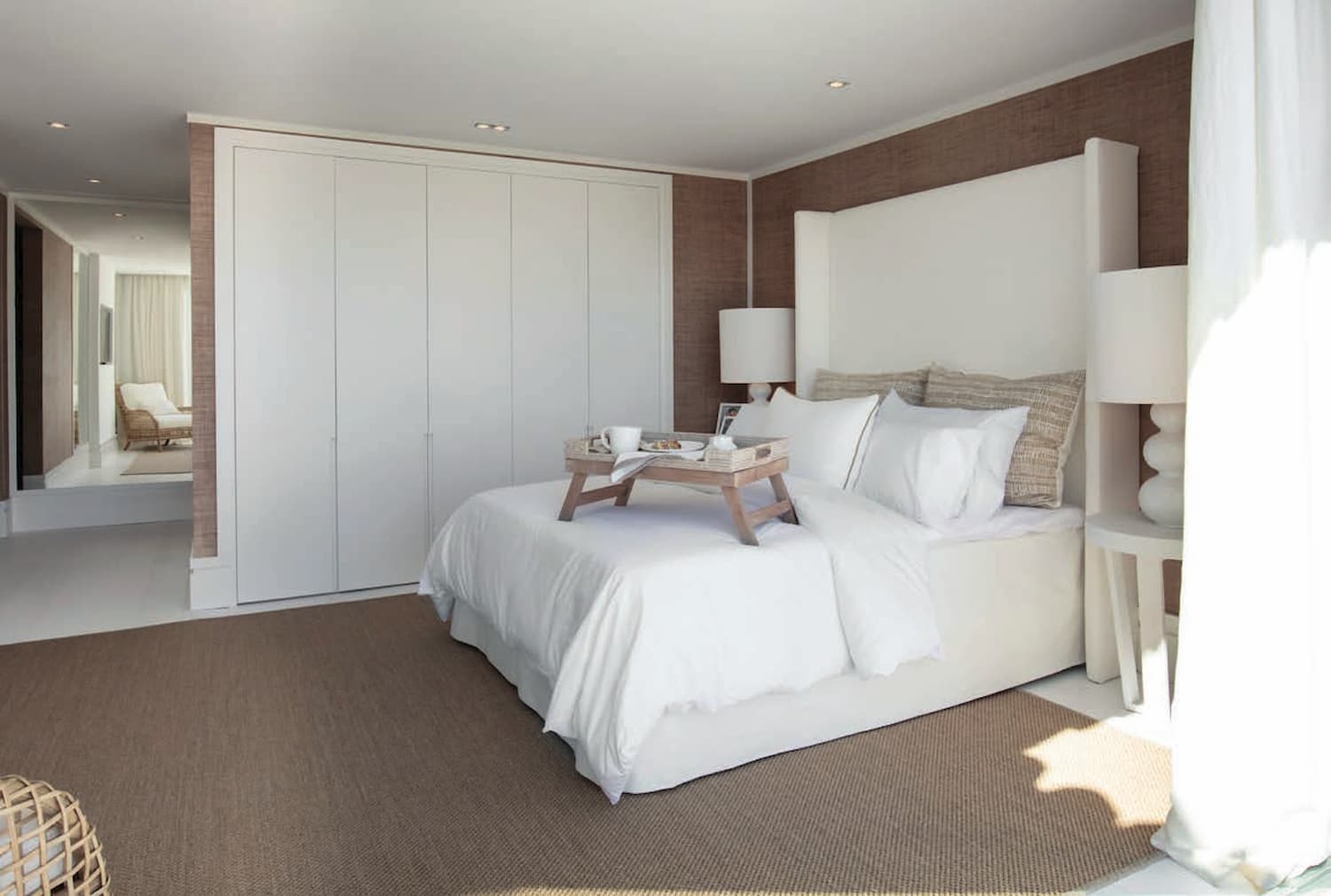 This custom-made headboard has a wooden frame filled with foam and upholstered in their Cloud textile which also carries through to the bed linen for a coordinated look.