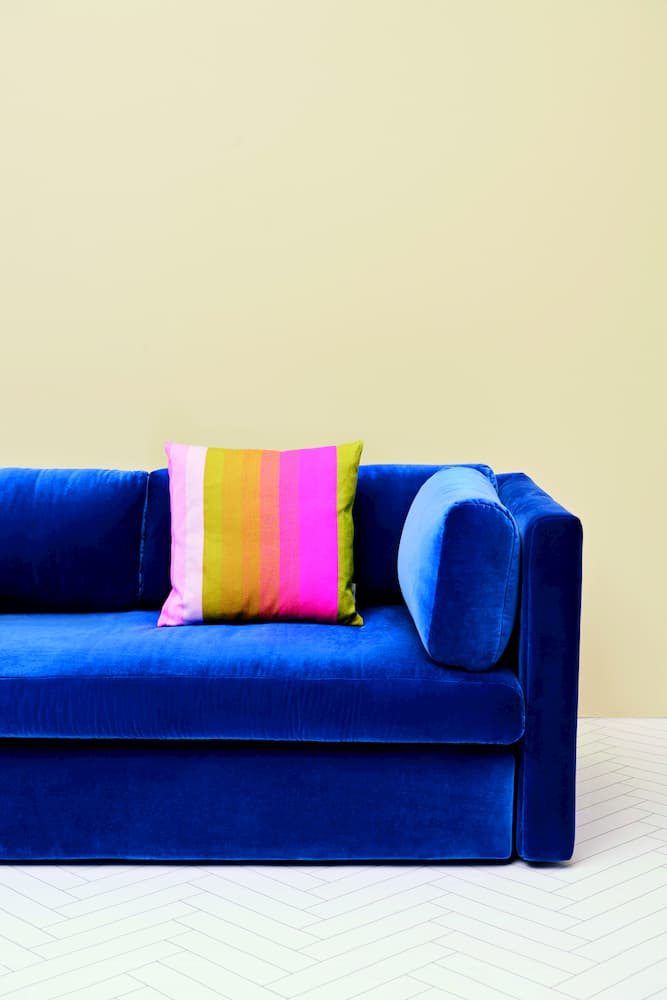 Designed by Dutch design duo Scholten & Baijings for Hay, the vibrant square cushion, simply called Colour, features stripes in graduating colours with a merino wool cover with feather filling. It comes in various designs. Shown here on Hay’s Hackney Harald sofa.