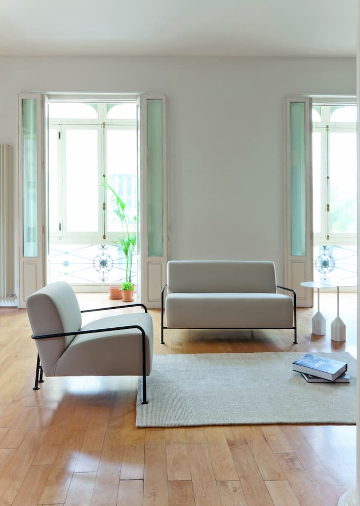 The compact Colubi armchair from Viccarbe was designed in a classic Bauhaus style. It has a steel frame with adjustable gliders and now comes with a solid oak armrest. Shown here with their Burin Mini auxiliary table, designed by Patricia Urquiola.