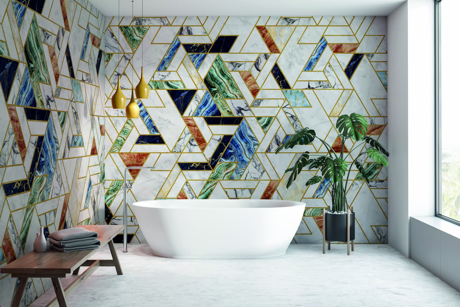 Malla Coralina wallpaper from Coordonne’s Random Archist collection comes in four different colourways. Its bold geometric design could be mistaken for tiles and makes a strong visual impact, especially in a bathroom.