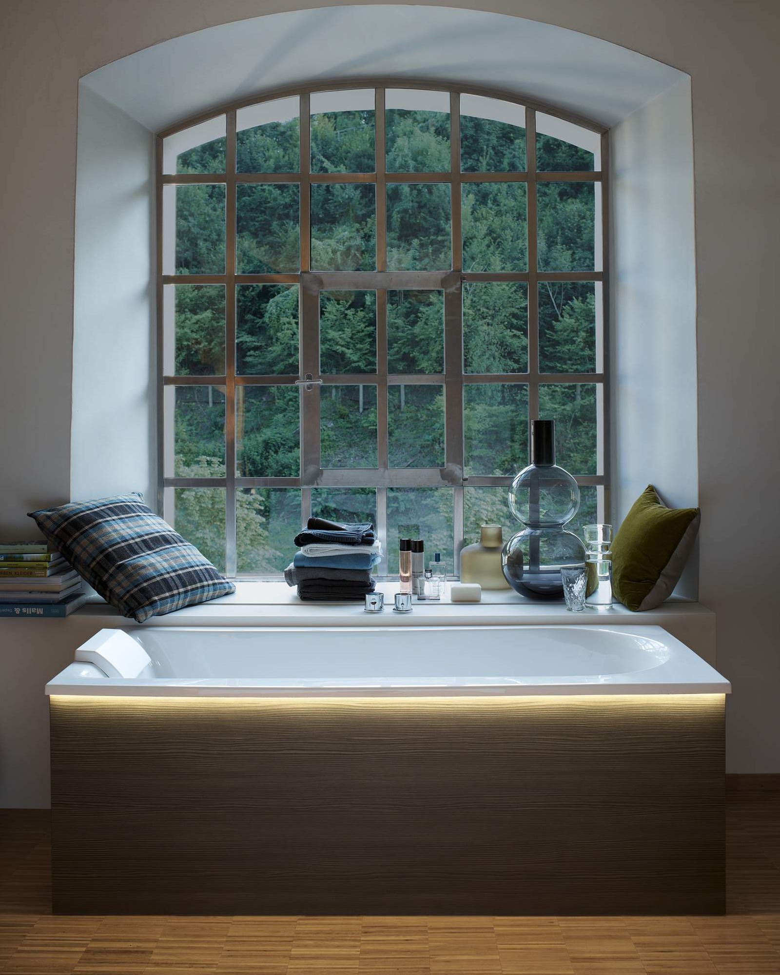 Rectangular Darling New bathtubs from Duravit come with an optional headrest and gentle LED lighting below the rim to create a relaxing and cosy ambience.