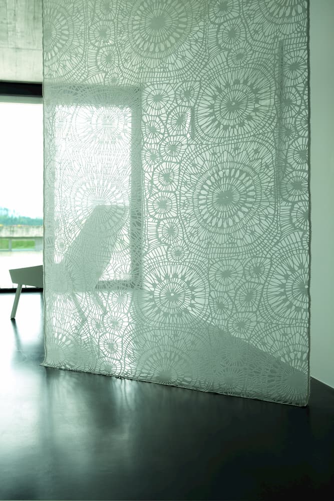 Creation Baumann’s Dentelle range comes in four different colourways. Its lacy appearance creates a sophisticated and delicate look, allowing light to filter through the intricate shapes in its stitching.