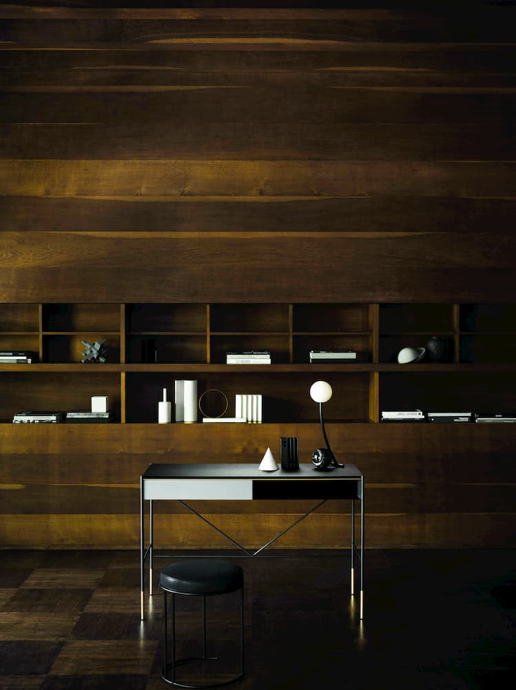 Living Divani’s new Era Scrittoio desk features striking geometric lines with slim metal legs and a wooden tabletop that holds two useful drawers
