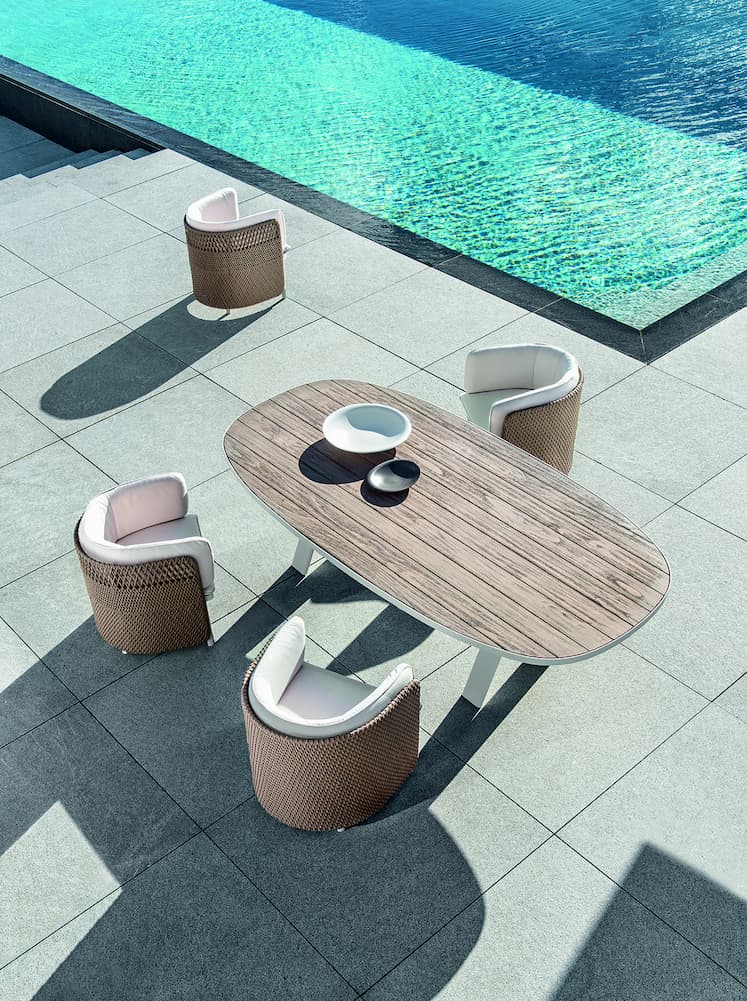 The Esedra collection from Ethimo was inspired by the Ancient Roman “exedra”, which was a semi-circular space where social gatherings and philosophical debates were held. The back of the seat is made of synthetic fibre treated with a technology that recreates the look of natural woven fibre.