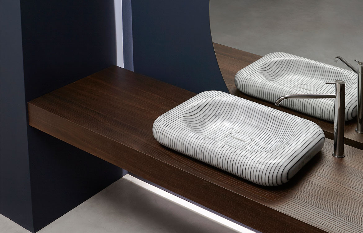 The new Gessati countertop washbasin range from Antonio Lupi sports eye-catching pinstripes. Sheets of Carrara marble are glued together using a coloured resin to create a striking and dynamic visual effect.