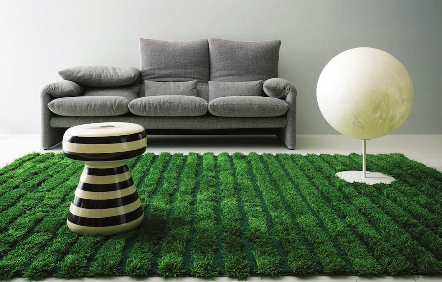 Kasthall’s tufted Ines rug is made from coarse wool yarn and linen, with a contrasting surface in low bouclé. It is the sister of Kasthall’s iconic Moss rug. Shown here in their Jungle version, designer Maja Johansson has shaped stripes with shadows to create a striking look.