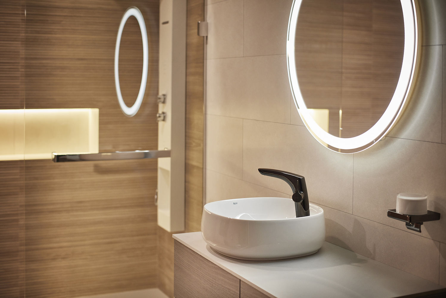 The Insignia faucet range from Roca features smooth lines that ooze elegance. Shown here in sleek black, it has a single lever washbasin mixer with a high spout and is a perfect match with their Fineceramic countertop washbasin and Roca’s Beyond rimless wall-mounted toilet – which has a dual outlet and a Supralit lid with soft-close functionality. Their Surfex oval bath has beautiful curved lines with an integrated non-slip floor. Roca also offers bathroom furniture and mirrors that come with built-in illumination.