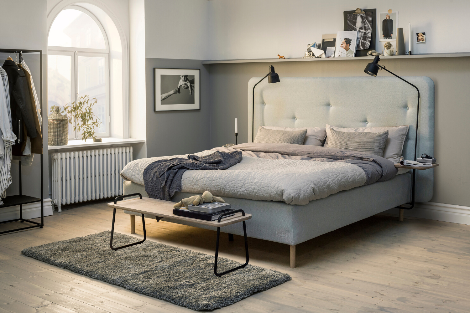 The Diplomat bed from Jensen Store’s Nordic Line comprises a slim, textile buttoned headboard and an add-on bedside table with a wooden top and powder-lacquered steel legs. It can also come with a reading lamp with two movable joints to easily control the light beam.