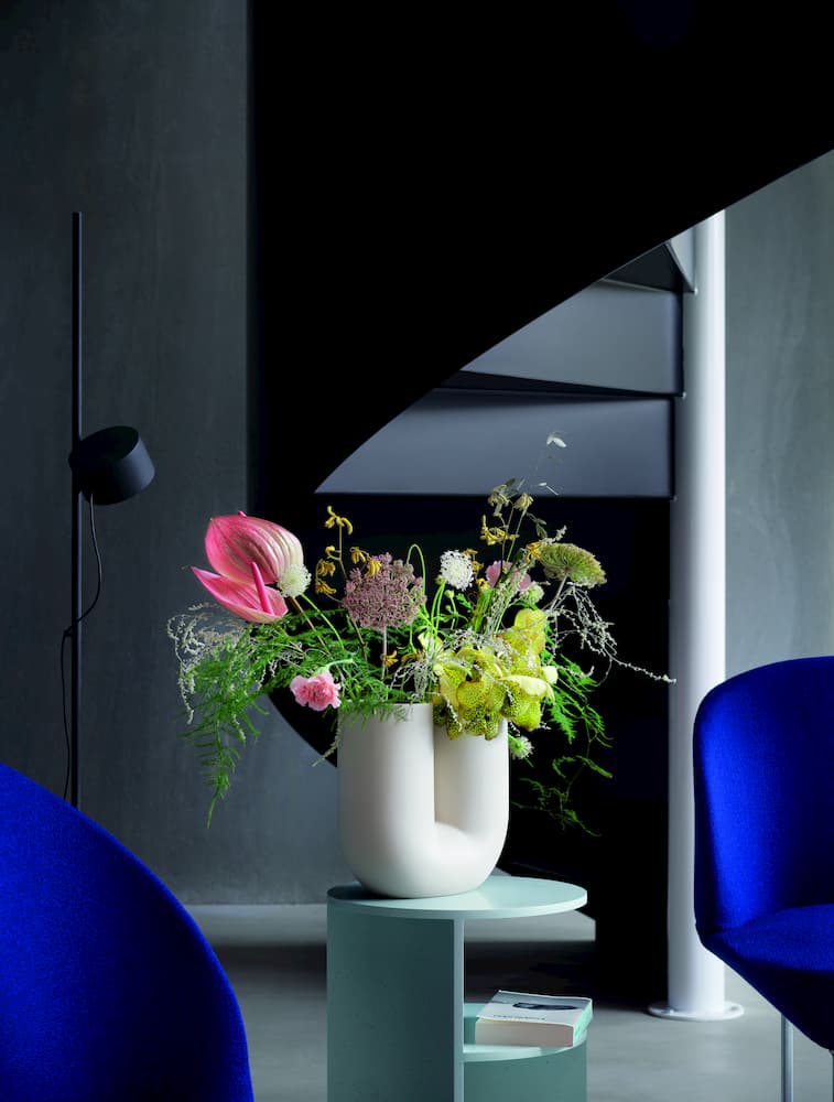 The Kink vase from Muuto is made from pigmented porcelain which is unglazed on the outside and glazed inside. It has a contemporary minimalist design, perfectly setting-off any botanicals placed within its sculptural shape, and it comes in white, sand or light blue.