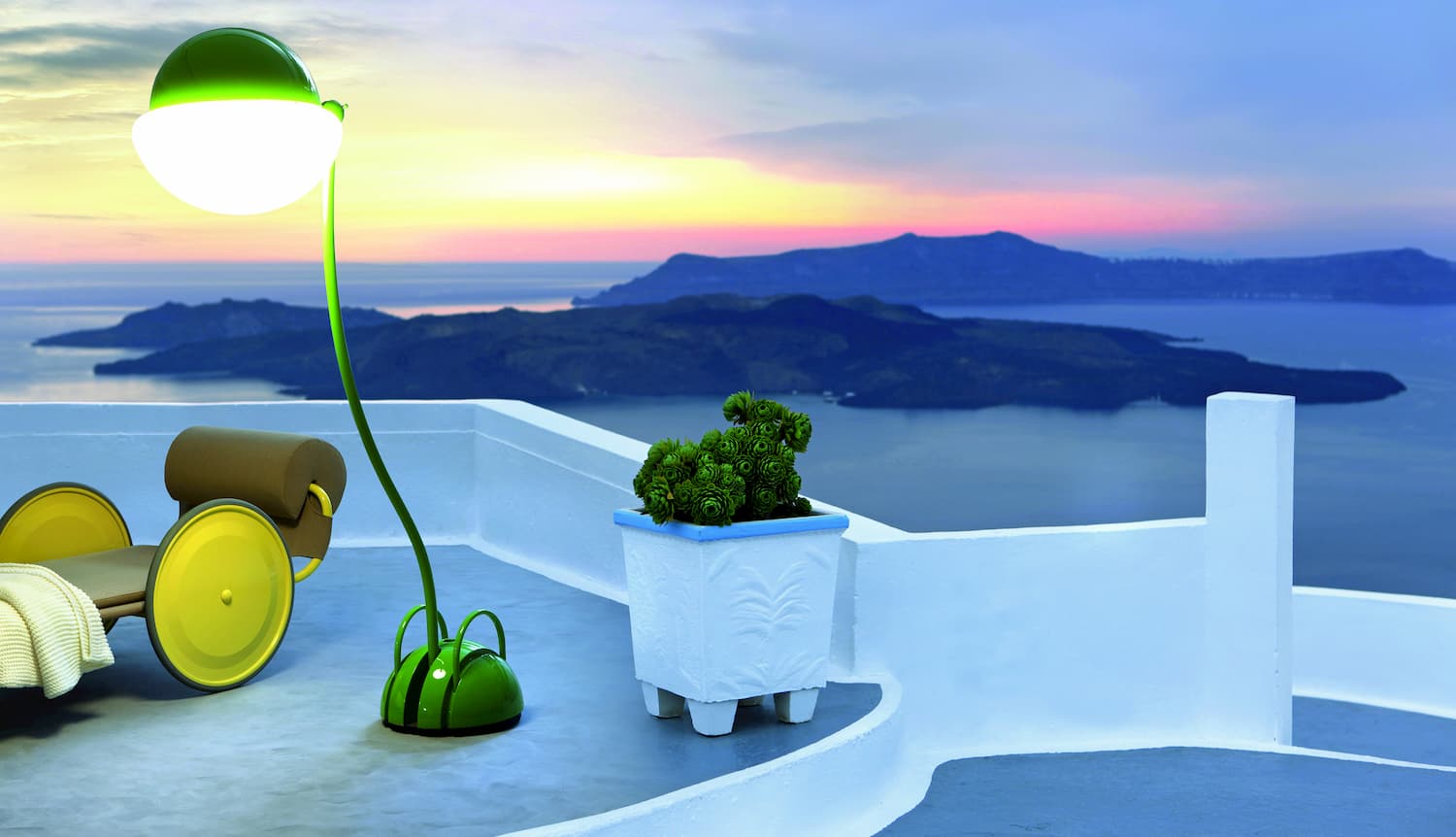 The Locus Solus sun lounger from Exteta is strong but also lightweight. Designed by Gae Aulenti, the tubular steel frame, large wheels and bolster-style headrest in playful bold colours certainly draw the eye. Shown here with their brightly painted and eccentric floor lamp, also from the Locus Solus collection.