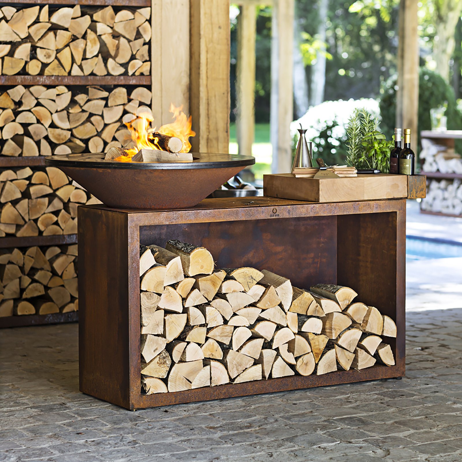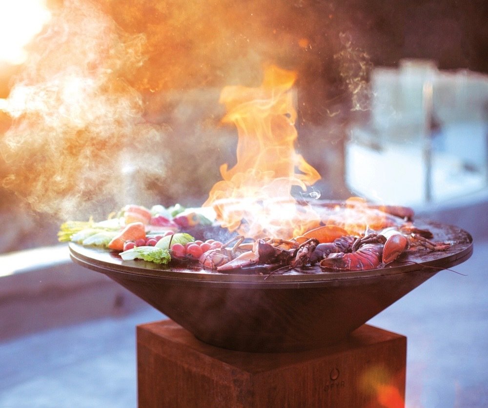 The OFYR doubles-up as a grill and a firepit. It has a handy wide circular rim where ingredients can be cooked or simply rested. When not being used as a grill, it can also be turned into a firepit, with natural flames being viewed from 360 degrees. There are complimentary furniture items that come with the OFYR, including cabinetry to store wood and benches to serve as an extra workstation.