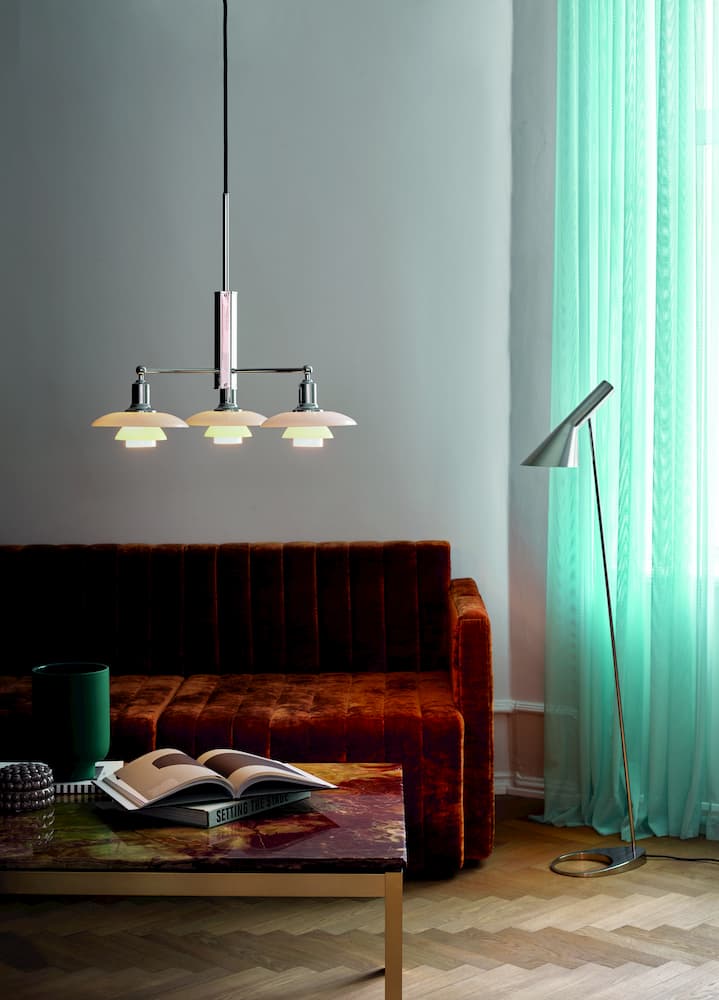 The PH 2/1 Stem Fitting pendant lamp from Louis Poulsen is a fixture designed on the principle of a reflective three-shade system, directing most of its light towards the floor. The shades are made of mouth-blown opal three-layered glass, which is glossy on the top and sandblasted matt on the underside, giving a soft and diffuse light distribution.