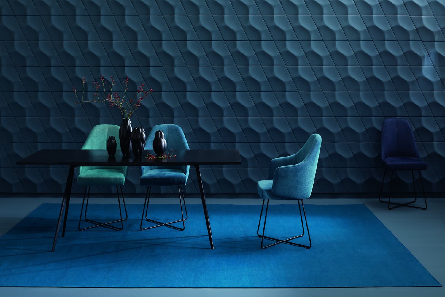 The Pure hand-woven collection from JAB Anstoetz Flooring, shown here in deep electric blue, comprises five Kilim versions that vary in pattern and weaving structure in a total of 196 colours.