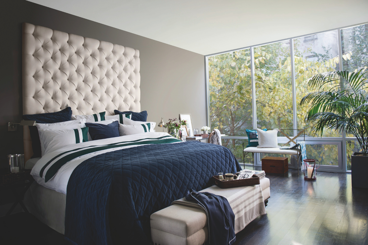 This beautiful bed linen from Lexington mixes crisp white sheets and pillows with an ivy green stripe and a regal blue bedspread and cushions, all made from high-quality fabric. The overall look is coordinated, luxurious and inviting.