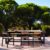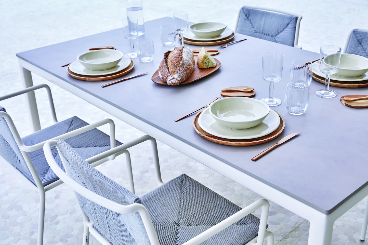 This rectangular dining table features a powder-coated aluminium frame in cream or metallic grey with adjustable legs, while the top comes in porcelain or compact laminate