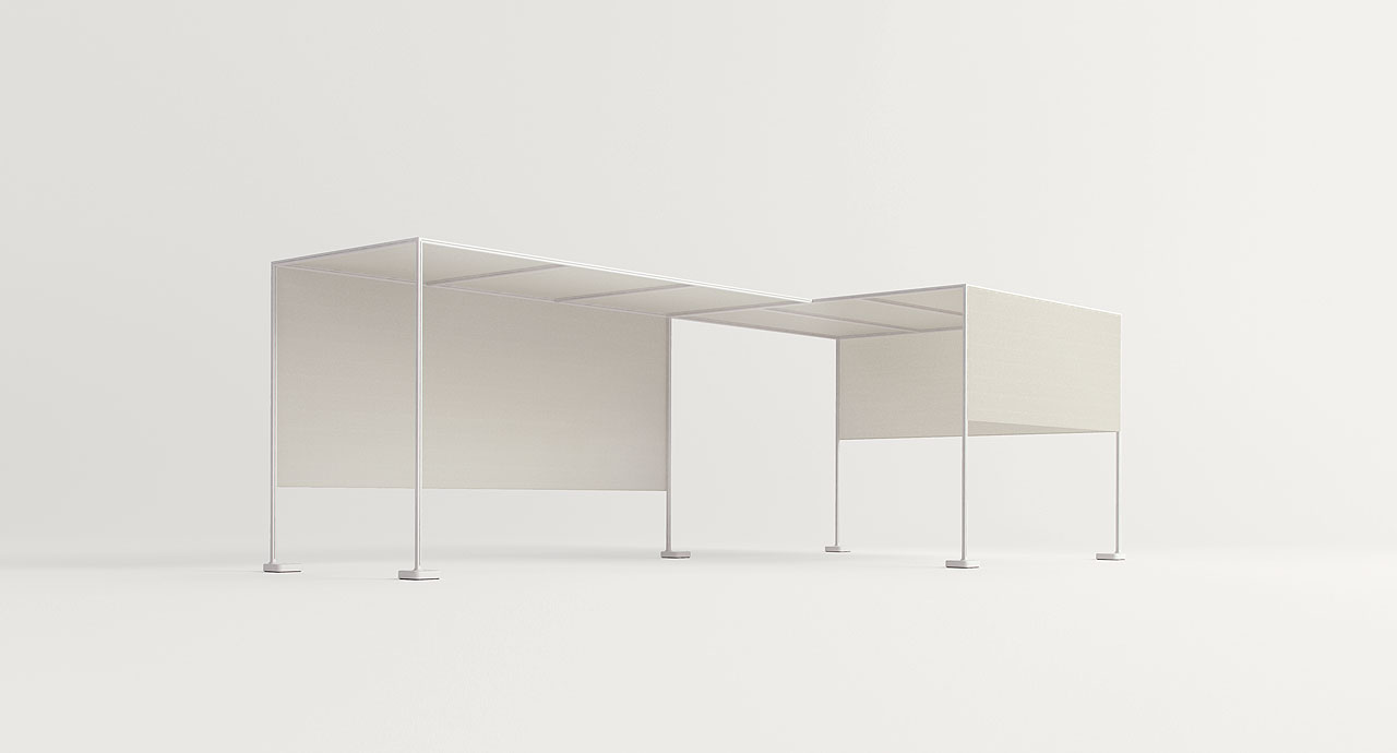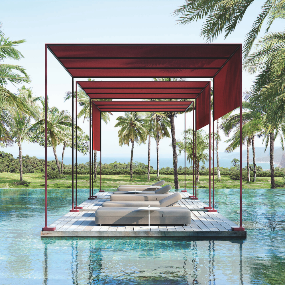 The Resort pergola from Paola Lenti comprises 100% polyester. The frame is made from aluminium which is supported from a ground base in moulded cast iron varnished in the same colour as the frame.