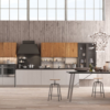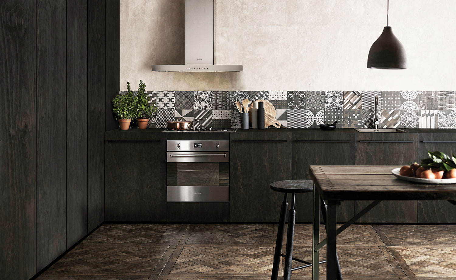 The Smeg SF6390X thermo-ventilated oven features a classic design with finger-proof stainless brushed steel and a vapour cleaning system. It is shown here with their chimney brushed stainless steel extractor hood.