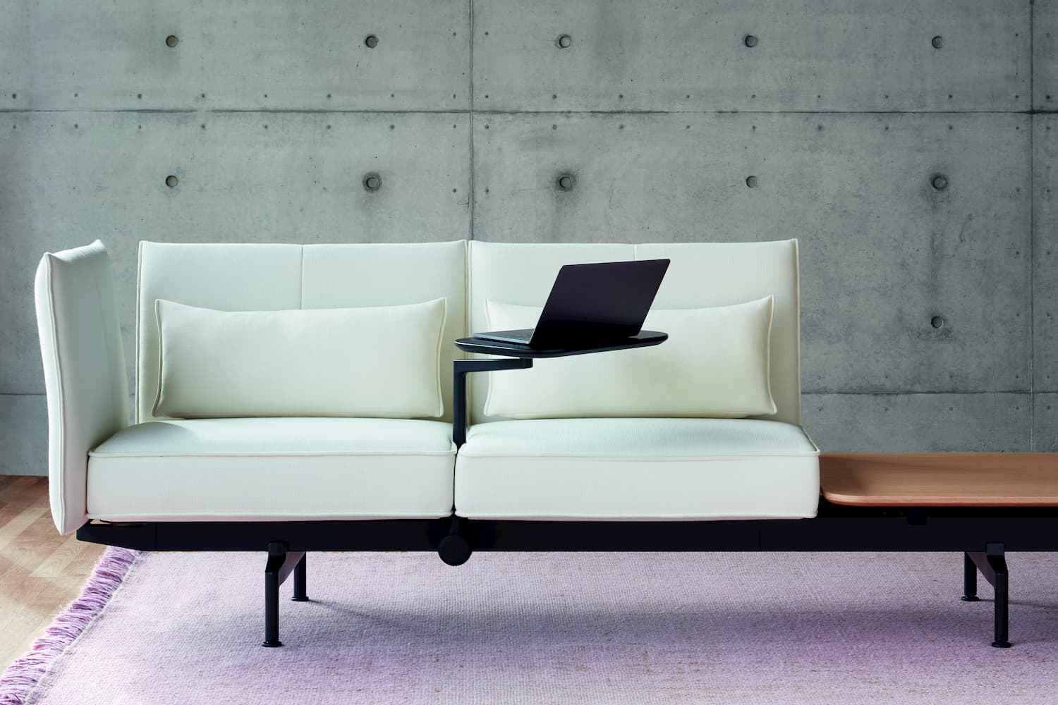 The innovative Soft Work sofa from Vitra comes with a table that swivels around to suit your working position, and it is also equipped with charging facilities, partition screens and comfortable padded seating and headrests