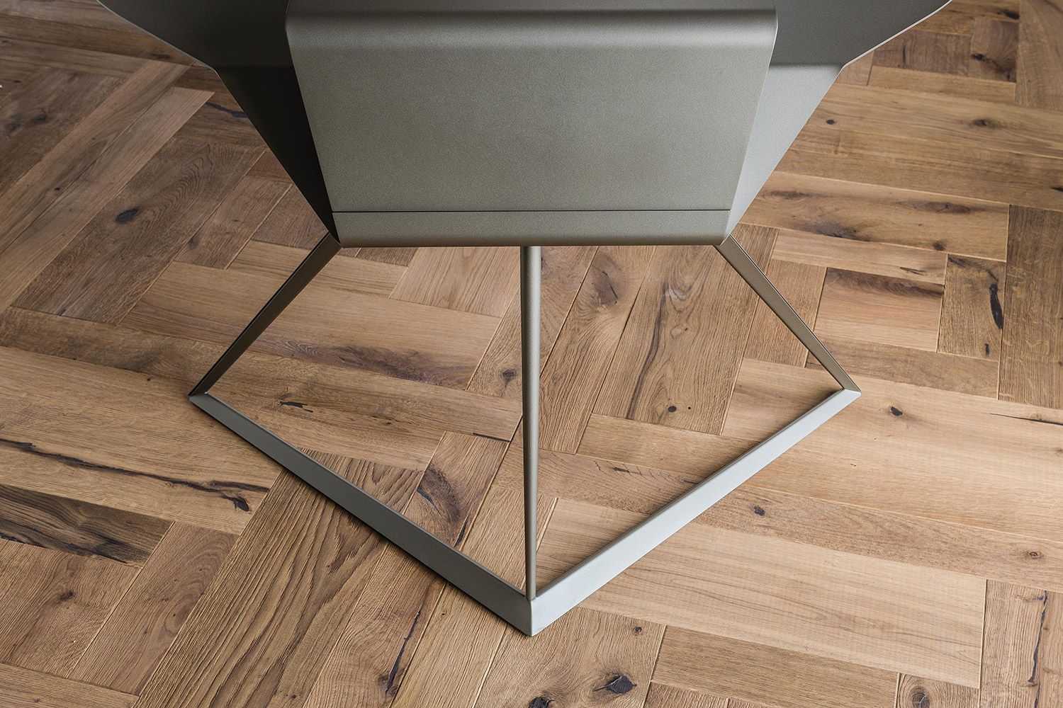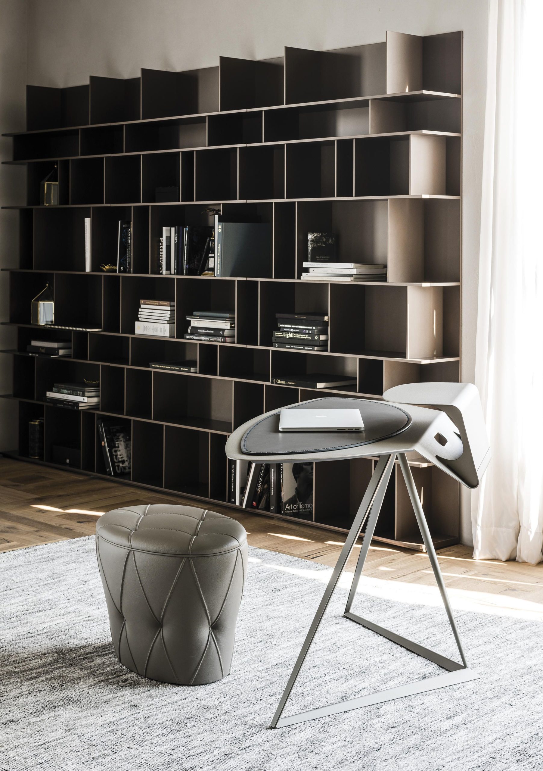 The Storm desk from Cattelan Italia has a titanium top and frame that comes in both white or graphite — and embossed lacquered steel and leather pad.