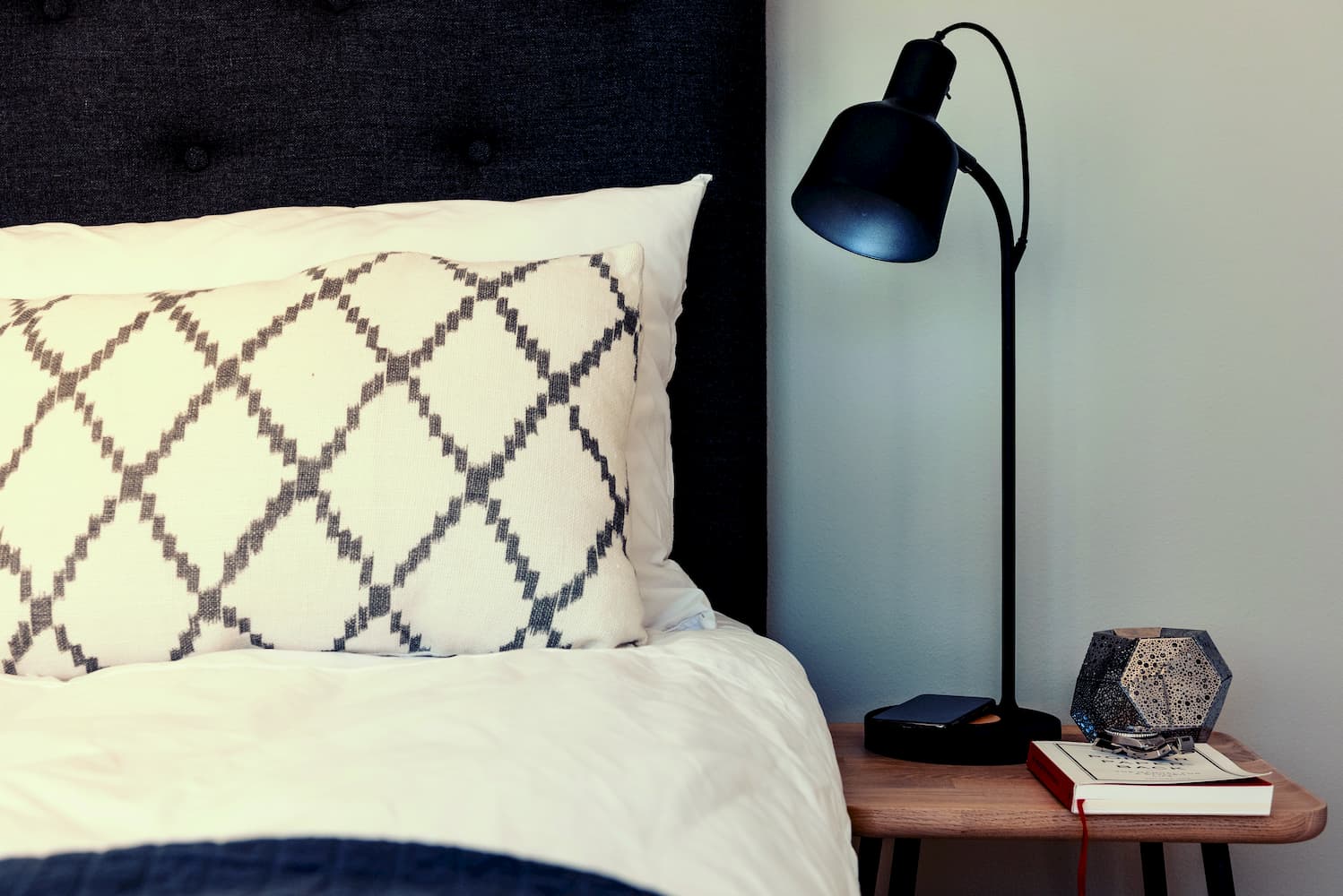 This innovative new table lamp from Jensen is made from black powder-lacquered steel with an adjustable aluminium shade. The light source is slightly shielded by the screen, providing an excellent and even reading light, and it will not bother anyone else in the room who is trying to sleep. It has a charging panel for any mobile phone, earplugs or smartwatch that is compatible with Qi charging. For Apple this would be the iPhone 8 or a more recent model. Samsung and Nokia have advanced further with this technology, so there are more options for these brands. In addition to the charging panel there is a USB port in the lamp base, so you can charge two devices at once, and charge other devices that are not compatible with Qi.