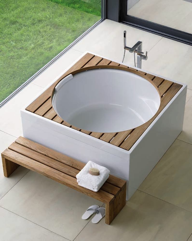 The Blue Moon from Duravit looks like a bathtub but is actually a whirlpool. It comes in various versions and has a waterproof remote control that operates the multi-coloured underwater light and the three Power, Relax and Emotion circuits that can be used separately or together.