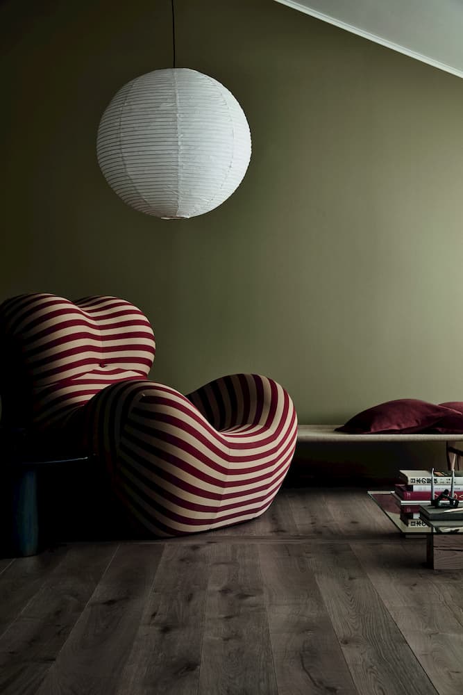 The Oak Old Vintage from Timberwise was inspired by old traditional flooring with wooden nails. Round wooden dowels were used to imitate wooden nails at the ends of the planks. Shown here with the Up 50 armchair from B&B Italia.