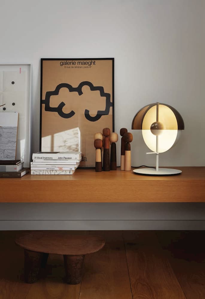 Marset named this table lamp after the Greek goddess Theia, who is the mother of the sun, moon and dawn. The lamp combines light and shadow, and can be swivelled to offer direct light or a softer diffused light.