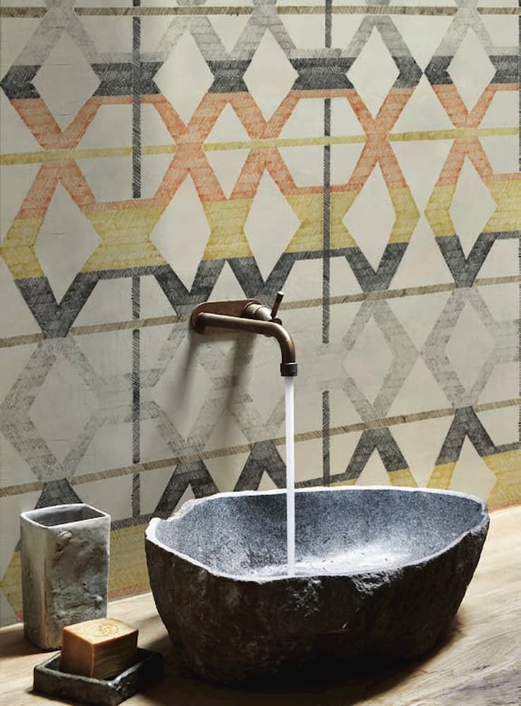 The Tuning wallpaper range from Wall & Decò derives from their highly-innovative Wet System, which prevents moisture entering the underlying layer – making it suitable for any kind of damp environment. The wallpaper also has a material-like effect with a semi-gloss finish, and is resistant to detergents – so easy to clean. It can be applied on a wide variety of surfaces such as glass, concrete and ceramic tiles.