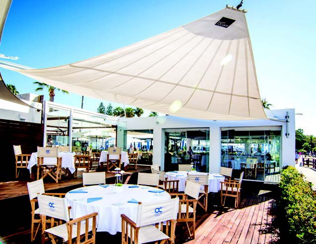 wanting to squeeze the most out of their valuable external square metres! Where possible, we prefer simple and clean-cut solutions and each project, no matter the size or budget, is an enjoyable challenge. We focus on optimal qualityfor- budget ratios and therefore our solutions are affordable for everyone who is willing to invest in a quality shade solution that will last for years. However, there are always projects that stand out, albeit for the mere size and scope of the areas to cover. In this respect our Ocean Club project is a real eye-catcher. Over the years, we have developed an excellent understanding of what both management and customers want, and our combination of fixed and automatic retractable sails shading the large outdoor restaurant area is exemplary of the elegant yet functional solutions we add.