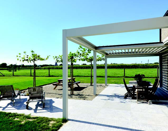 At the beginning of 2016, we decided to add bioclimatic pergolas to our product range. This ground- breaking concept in patio covers – which regulates the temperature and ventilation of your patio naturally while protecting you from the sun and bad weather – originates from western Europe where the climate is colder yet people are desperately seeking to extend their indoor living to the outdoors. Brustor, the Belgian premium brand for awnings, has been developing its sleek design aluminium pergolas from the very start, and its systems have been tested with thousands of installations in the most severe climates across Europe. Highly technology driven, Brustor now is also the first on the market with a fully convertible pergola, whereby the roof louvers not only rotate in a 150-degree position like the other models, but also can slide completely to one side, opening up the whole roof for those starry evenings or to welcome the warming sunlight in between seasons. Acoola demonstrated the versatility of this new model during the Estepona Home Fair, where it was very well received by visitors. What we like most about the Brustor pergolas is the seamless integration of the modules with the surrounding architecture and the fact that they are endlessly accessorisable: according to each budget, a client can start with a basic open module, and then afterwards, without any visible alteration, integrate sliding glass doors or the popular curtains to close the sides, add automatic wind and bug screens that are already built-in in the frame, put up an infrared heater, LED lighting, etc… However, irrespective of the specific model one chooses, the key reasons for opting for a pergola remain the same: the motorised remote controlled blades for opening the roof when and where you want, the protection from rain with built-in rainwater drainage gutters and wind resistance up to 165 km/h, the natural temperature regulation and ventilation, avoiding the greenhouse feel, and last but not least the easy maintenance, just using plain water from below.