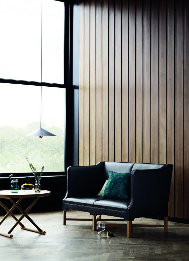 Above The Pacha lounge chair from Gubi was designed by French designer Pierre Paulin in 1975, with the aim of offering low seating and eliminating the need for chair legs. Its curvaceous form provides a cosy contemporary aesthetic in a vibrant blue. Shown here with Gubi’s coffee table, side ta-ble and pendant light (www.gubi.com). Above Right Kaare Klint, designer of the Klint sofa for Carl Hansen, created two seats with leather upholstery and a high back and sides with crossbars underneath to give it an eye-catching iconic look. Shown here with Carl Hansen’s folding Egyptian coffee table. Available from BoConcept Plus Store on the Mijas Road and C. de Negocios Oasis in Mar-bella (www.plusstore.es).